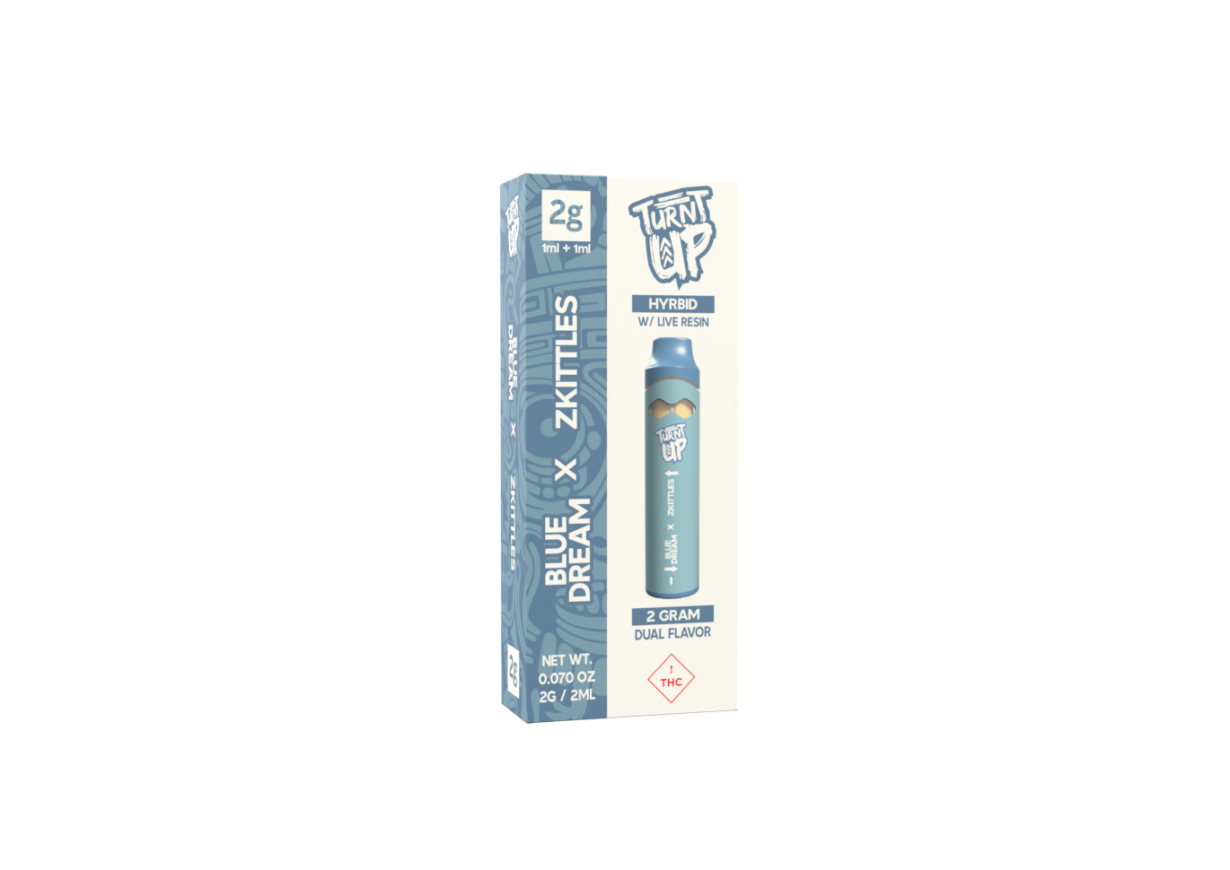 Try one flavor. Try the other. Or turn it up and mix them both. Our Turnt Up 2g Dual Flavor Disposable with Liquid Diamonds and Live Resin is designed for those who want variety and potency in one device. Featuring Blue Dream and Zkittles, this disposable lets you switch between two distinct strains or combine them for a unique experience using a built-in switch mechanism.